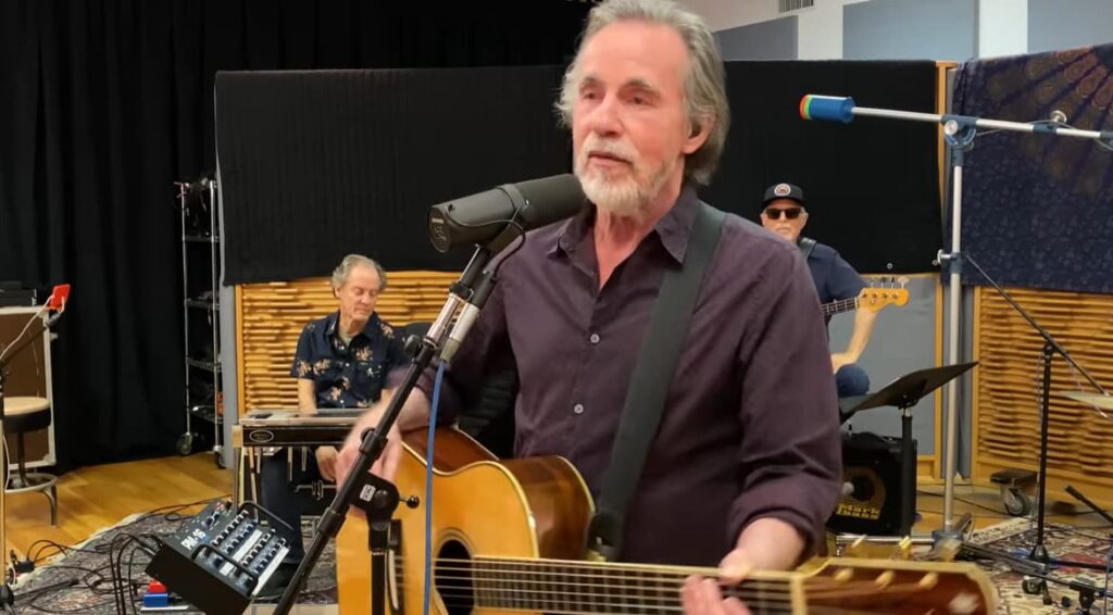 The studio setting enhanced the intimacy of the moment. Without the distance of a large concert hall, the performance felt personal and immediate, as though the listener were invited directly into the room. Browne’s vocal delivery was calm and reflective, shaped by decades of experience rather than dramatic emphasis. The musicians responded with sensitivity, listening closely to one another and allowing the song to breathe.