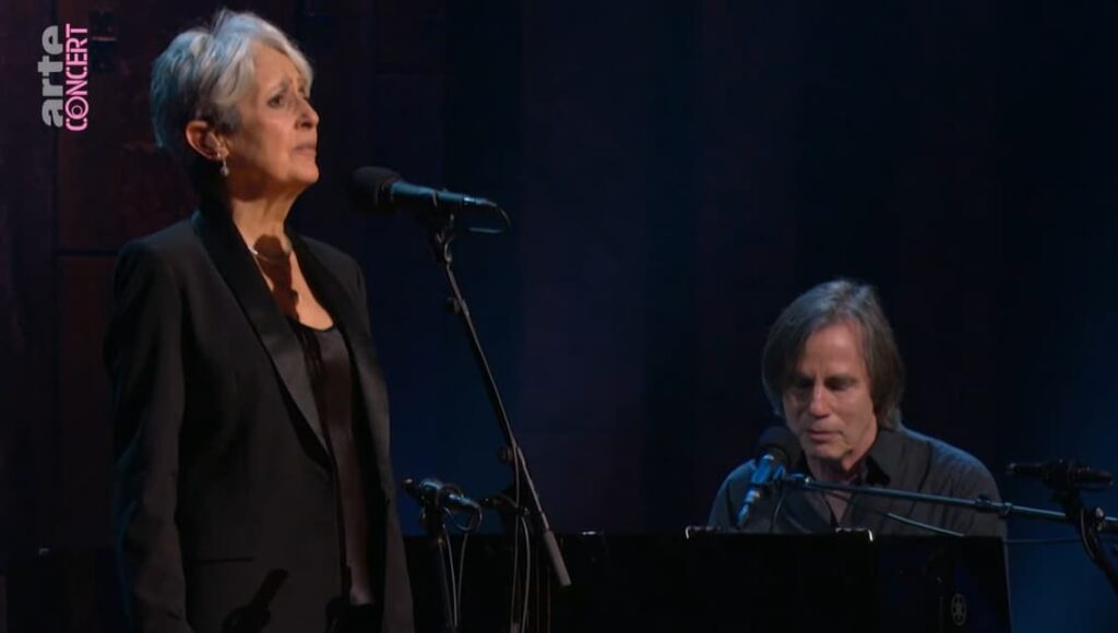 Musically, the live arrangement at the Beacon Theater is spare yet deeply resonant. Browne’s acoustic guitar sets a clear, ringing foundation, each note articulated with care, allowing the melody to breathe. Baez’s vocal presence brings a luminous counterpoint: her crystalline tone carries both solace and challenge, as though shedding light on the song’s deeper contours. The interplay between their voices creates a rich tapestry of sound that feels intimate even within the grandeur of the theater. It is a sound that invites listeners in, not just to hear, but to feel.