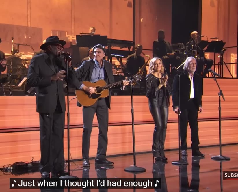 What makes this performance so compelling is the convergence of voices that have each spent a lifetime chronicling emotional truth. James Taylor brings a gentleness that has always suggested wisdom earned quietly. Jackson Browne carries a tone of moral gravity and introspection, shaped by songs that have long confronted time, responsibility, and consequence. Sheryl Crow adds a clarity and emotional directness that bridges generations, while Arnold McCuller, with his gospel-rooted power, grounds the performance in soul and spiritual resonance. Together, they do not compete for attention. They listen to one another, and in doing so, they allow the song’s meaning to deepen.