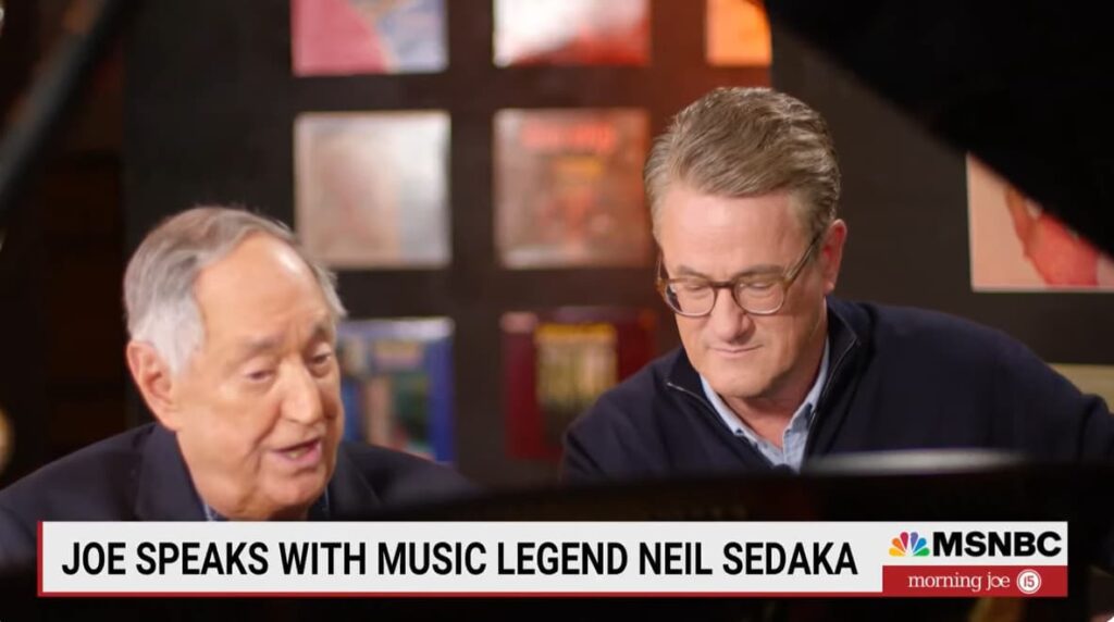 In a memorable televised conversation and performance, legendary singer songwriter Neil Sedaka offered audiences a rare glimpse into the creative mind that helped shape American pop music for more than six decades. Seated comfortably at the piano during an interview with broadcaster Joe Scarborough, Sedaka moved effortlessly between storytelling, musical demonstration, and reflection on the influences that formed his distinctive songwriting voice.