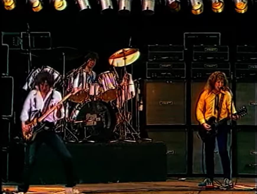 In this on stage performance, Slade focus on momentum rather than polish. Noddy Holder’s vocals are forceful and commanding, projecting easily over the crowd and reinforcing his reputation as one of the most distinctive frontmen of his generation. His interaction with the audience is central to the performance, turning the song into a shared experience rather than a simple recitation of a hit.