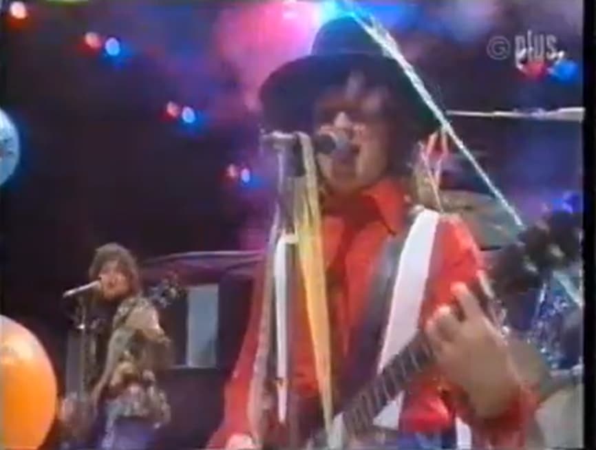 On stage at Supersonic, this sense of shared madness is palpable. From the opening chords, the performance is propelled by a stomping rhythm section, roaring guitars, and Holder’s distinctive, gravelly vocal delivery. The intentional phonetic spelling of the title reflects Slade’s playful and rebellious image at the time, and the chant like chorus was designed for audience participation, turning listeners into active contributors to the performance rather than passive observers.